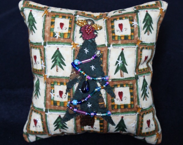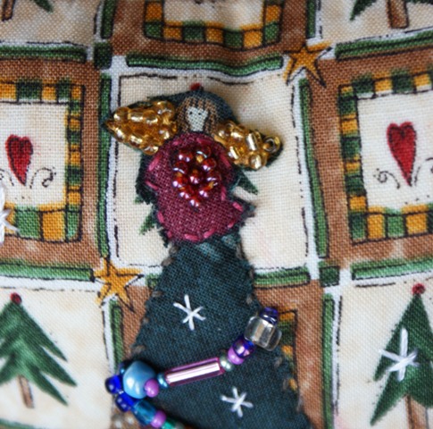 The tree and angel were cut from some of my Christmas fabric stash. I appliquéd it onto the base then beaded in some of the areas in the angel and some garland in the tree. I finished by quilting some little snowflakes on and around the tree.