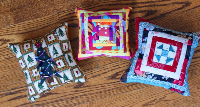 I chose a couple of different ones and the third was a creation of my own. They are a great way to use up small scraps of fabric. They measure about 4.5″x4.5″ and the 6 shown on the pattern picture were originally made from a charm pack of 40 different fabrics.