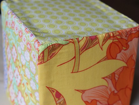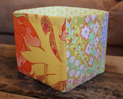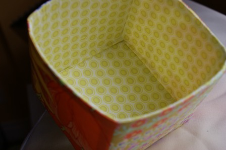 I wanted to use up some of that delectable new fabric I’ve been collecting. I chose some bright colours and made the box in two different prints with a third inside. The pattern called for some heavy, double-sided fusible interfacing. It’s very stiff and does a wonderful job of holding up the sides. The end product was originally supposed to be an 8″ X 8″ cube but I chose to make mine a little smaller. Mine is 5″ X 5″. It got a little fiddly in spots and difficult to iron the interfacing on to a 3-dimensional box but I was quite pleased with the outcome.